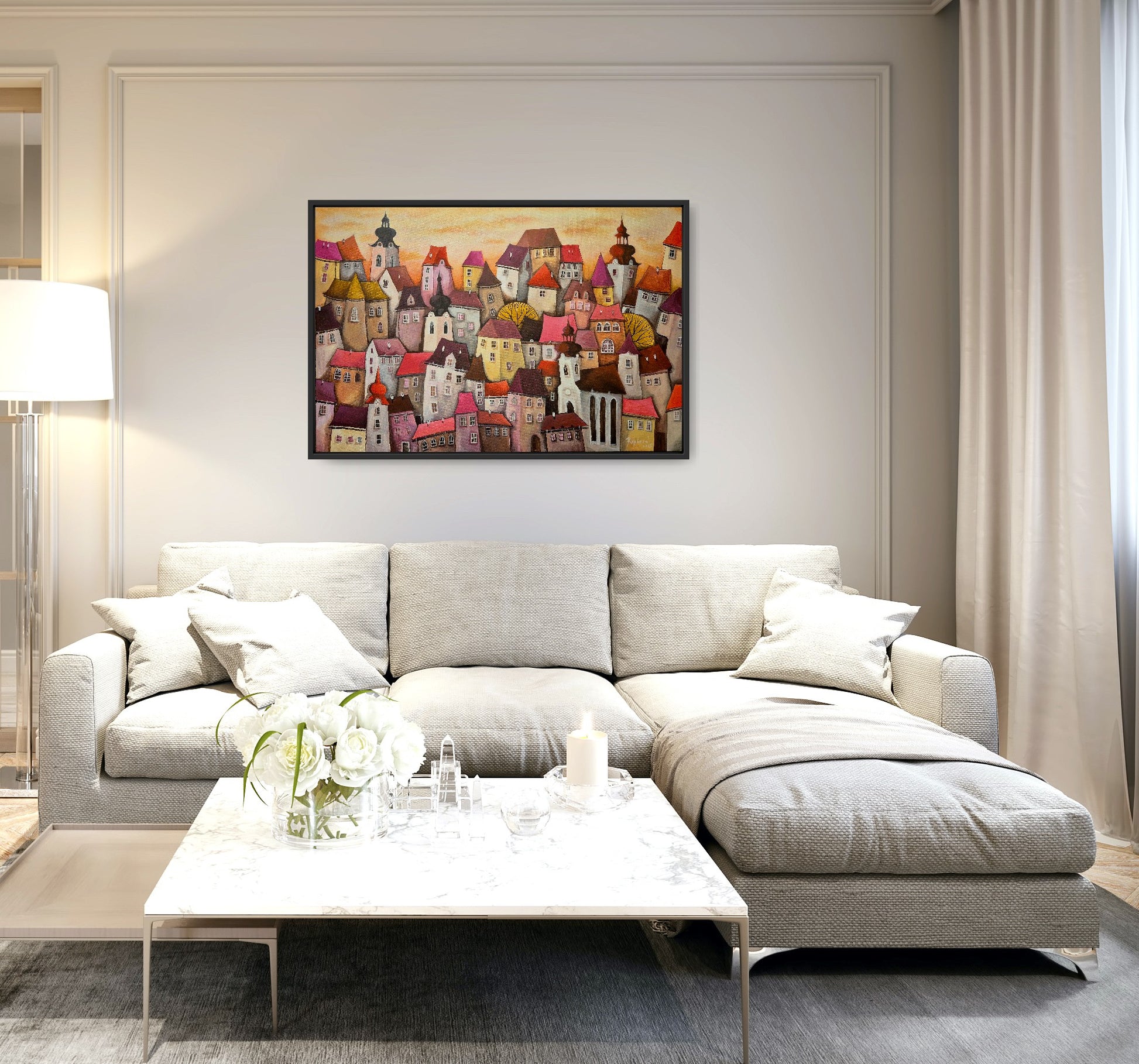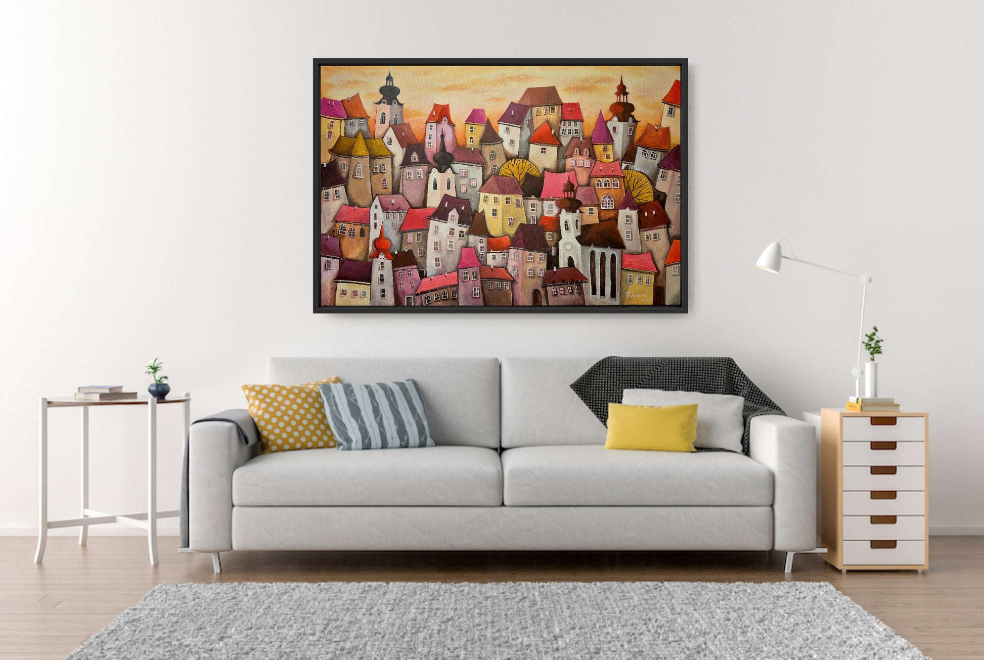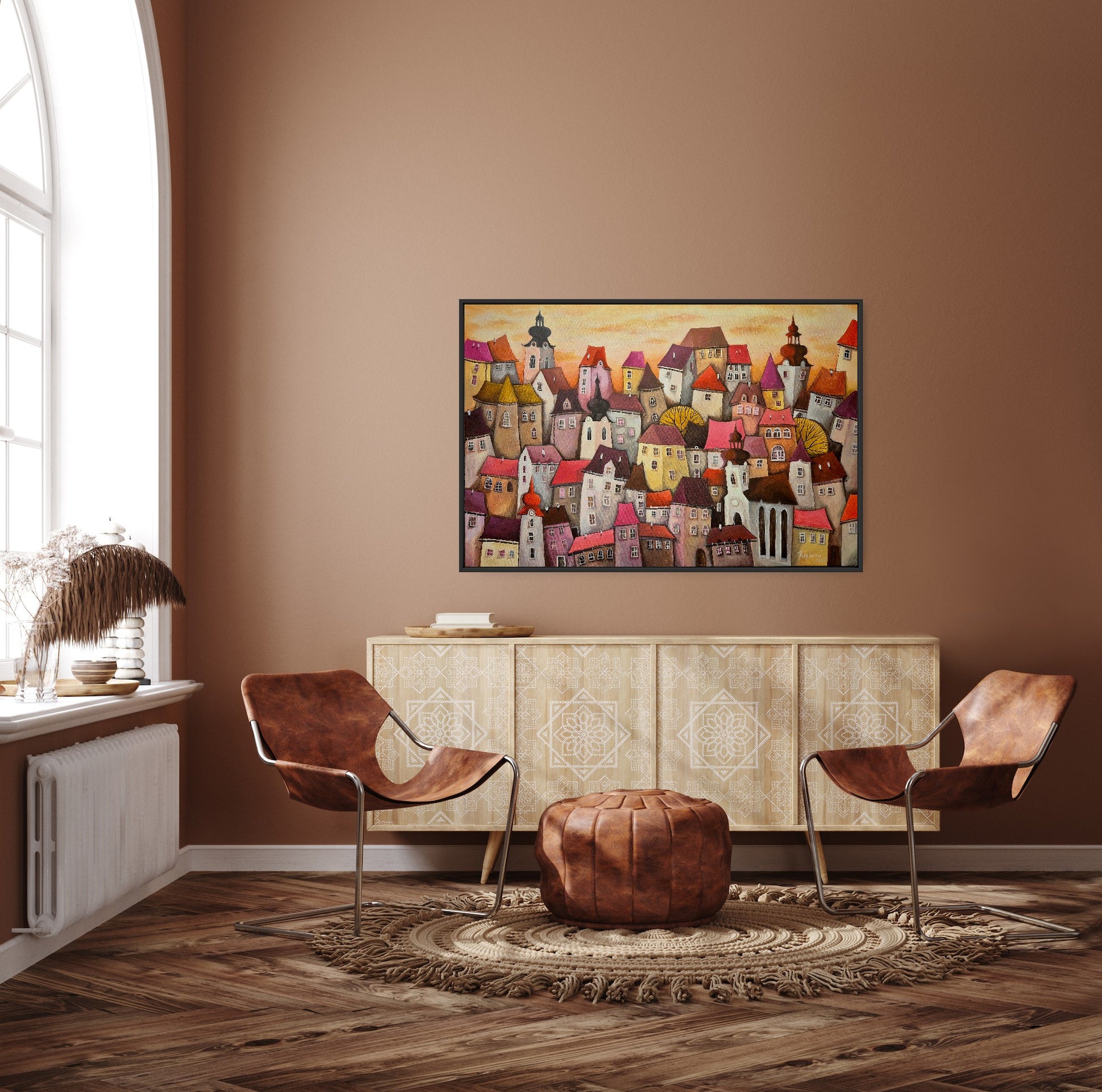 Obraz zobrazuje rozprávkovo pôsobiace mesto plné farebných, fantazijne tvarovaných budov. Domy sú namaľované v odtieňoch ružovej, červenej, žltej, hnedej a sivej, s výraznými strechami, vežičkami a oblúkovými oknami. Architektúra je hravá a surrealistická – budovy sa nakláňajú do rôznych smerov, prekrývajú sa a vytvárajú dojem snového sveta.