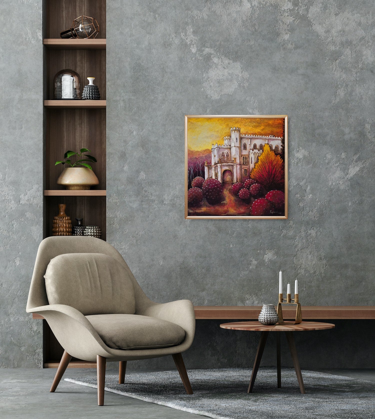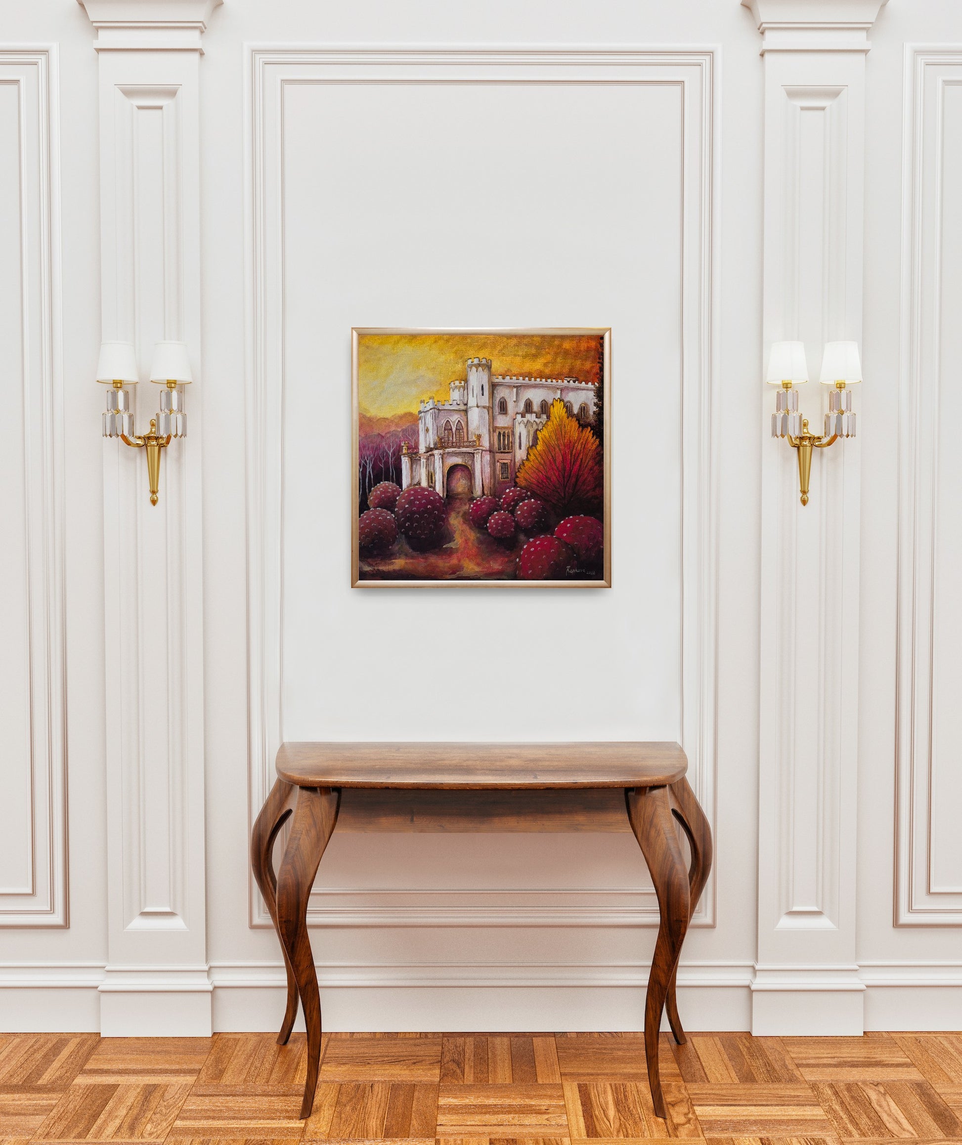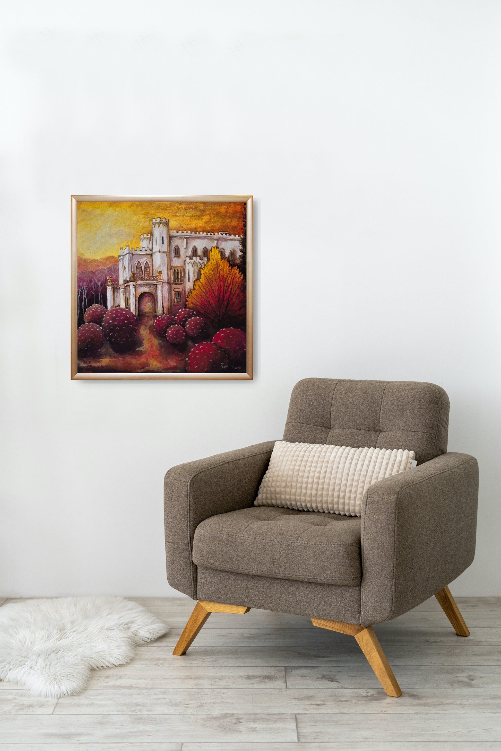 Dielo zachytáva ikonickú architektúru neogotického kaštieľa v Rusovciach, no vkladá ju do magického, až rozprávkového prostredia. Celému obrazu dominuje silný kontrast medzi chladnou bielou farbou stavby a teplými, ohnivými tónmi okolitej prírody.