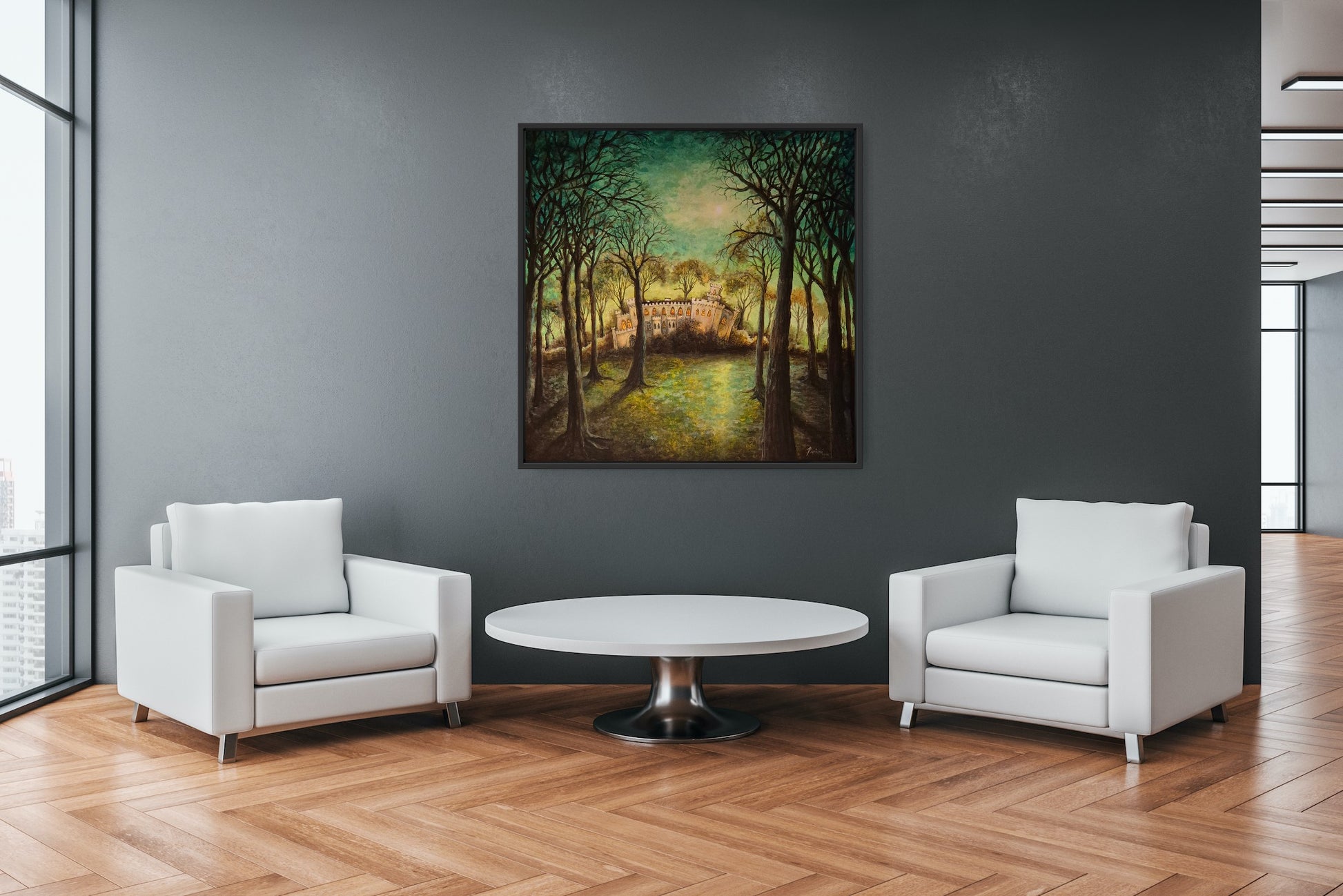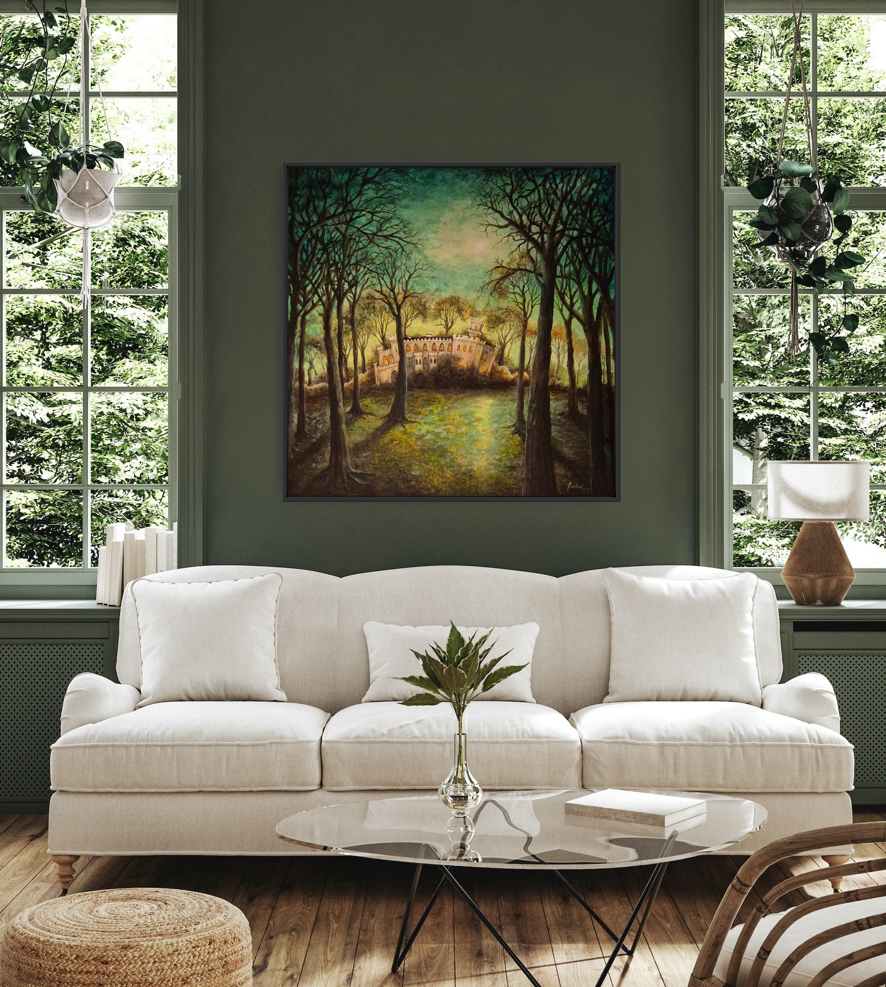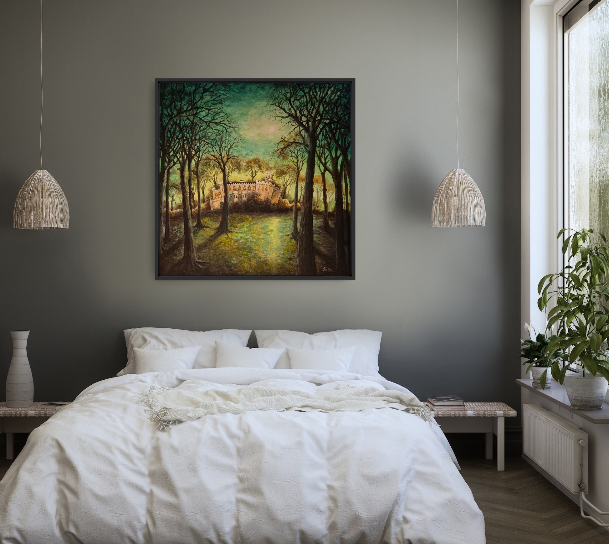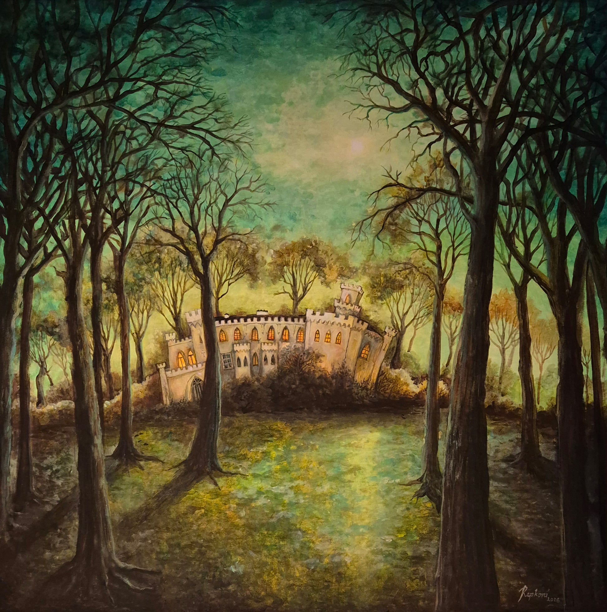 Tento obraz pôsobí útulne a tajuplne zároveň. Zámok uprostred lesa priam žiari v pološere. Zlatisté svetlo v oknách sľubuje pohostinnosť, hudbu a veselú spoločnosť, ktorá sa zišla na bále. Obloha v odtieňoch smaragdu a jasný mesiac dodávajú scéne snovú, bezpečnú atmosféru, akoby bol celý les pod ochranným kúzlom. Hoci sú stromy vysoké, ich koruny sa hore spájajú a vytvárajú nad zámkom akúsi prírodnú klenbu.