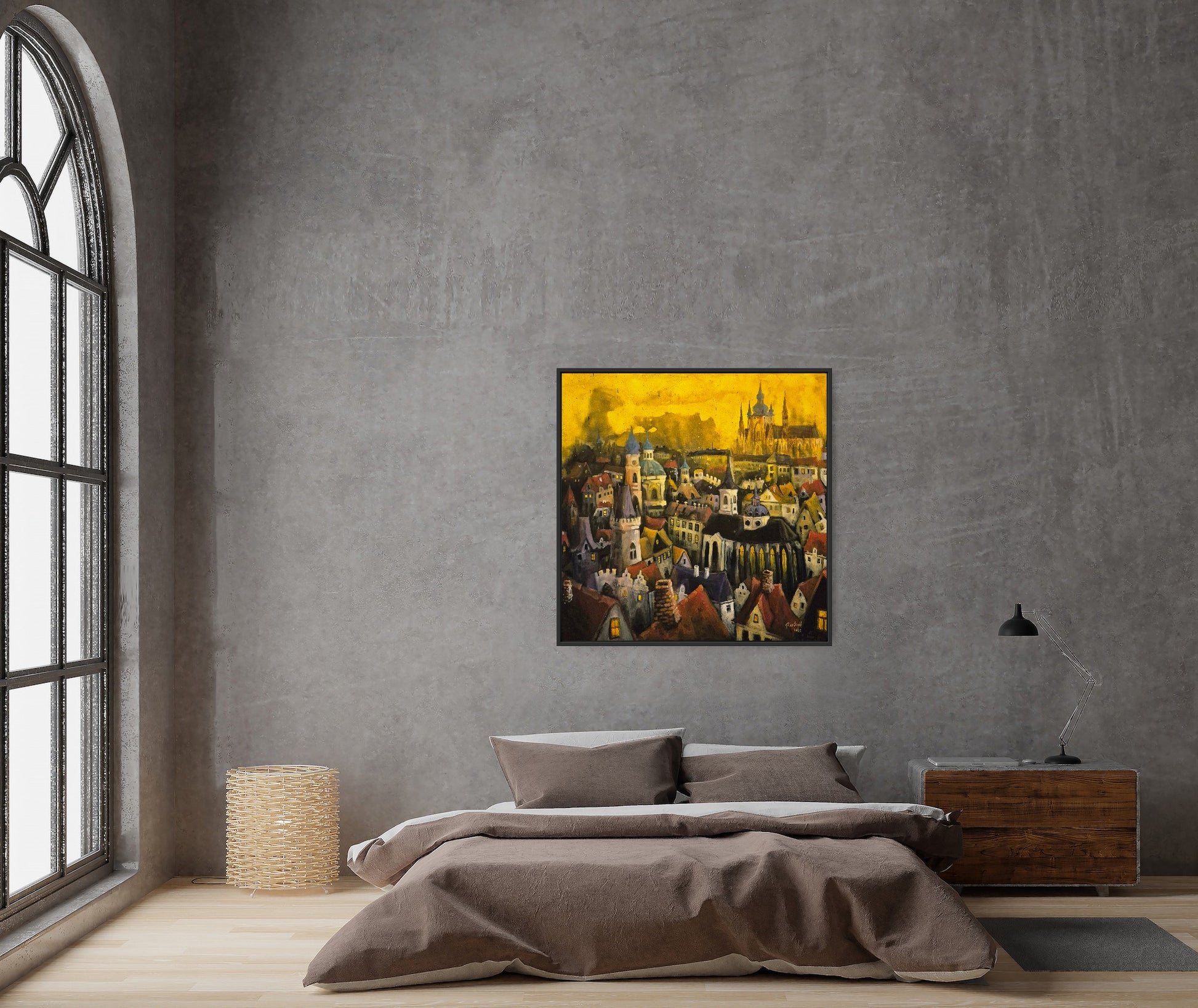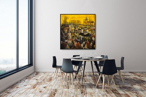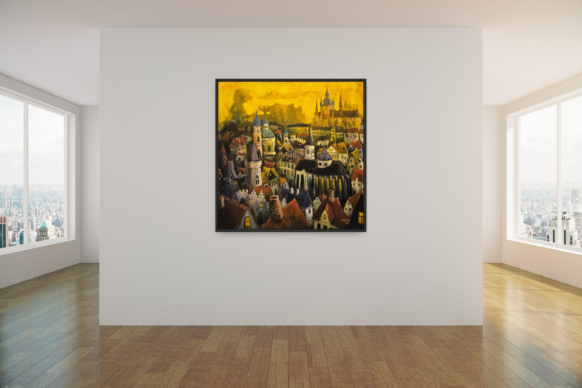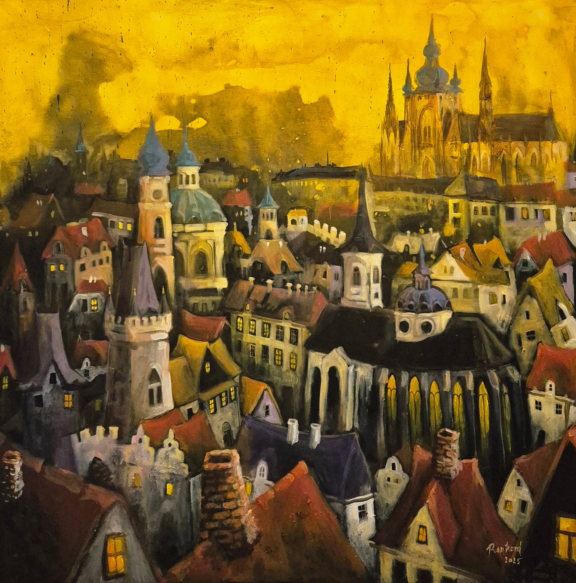 Obraz Praha v objatí súmraku zachytáva Prahu v zlatistom svetle. Jedná sa o akrylovú maľbu o veľkosti 100x100cm.