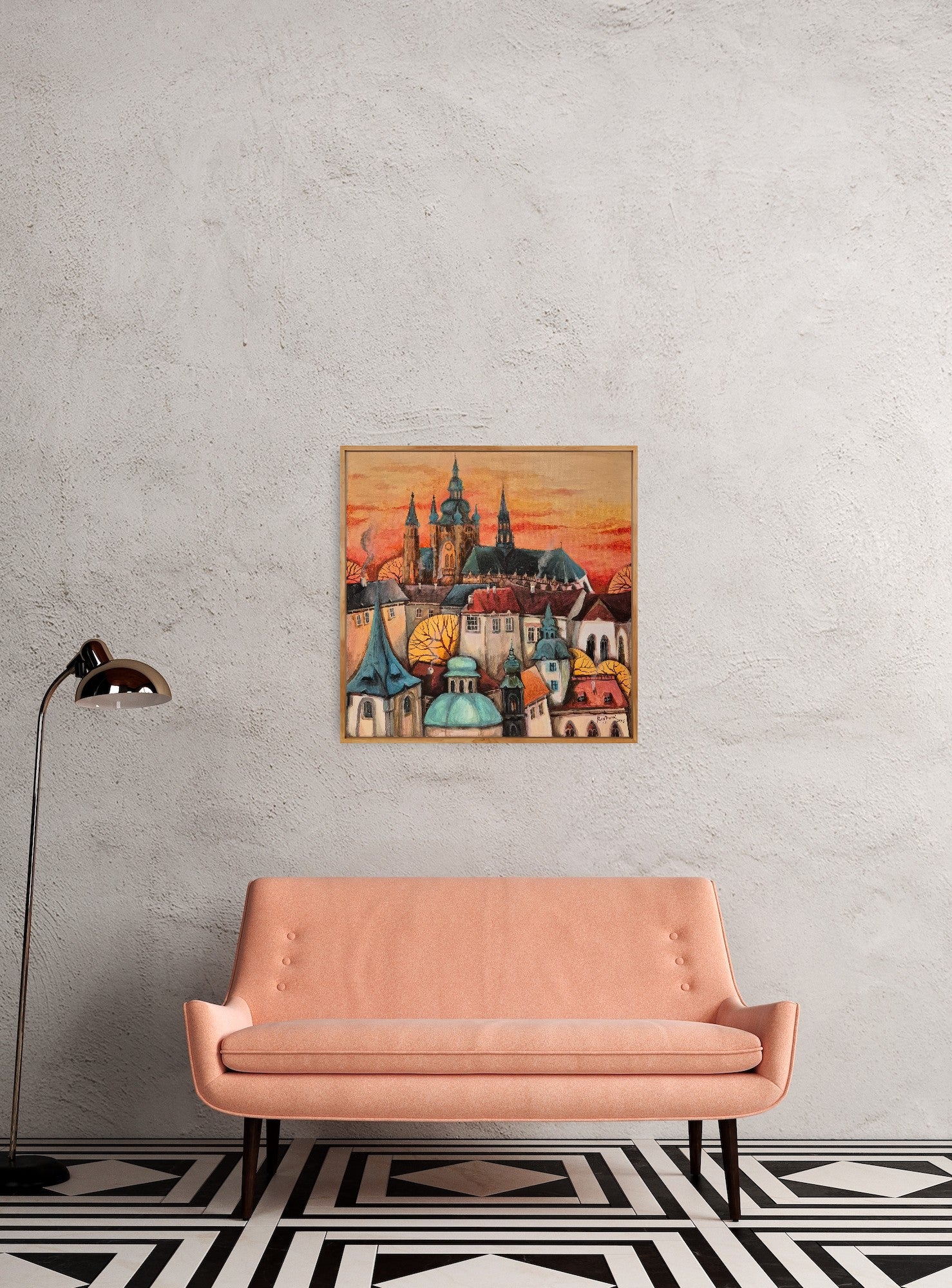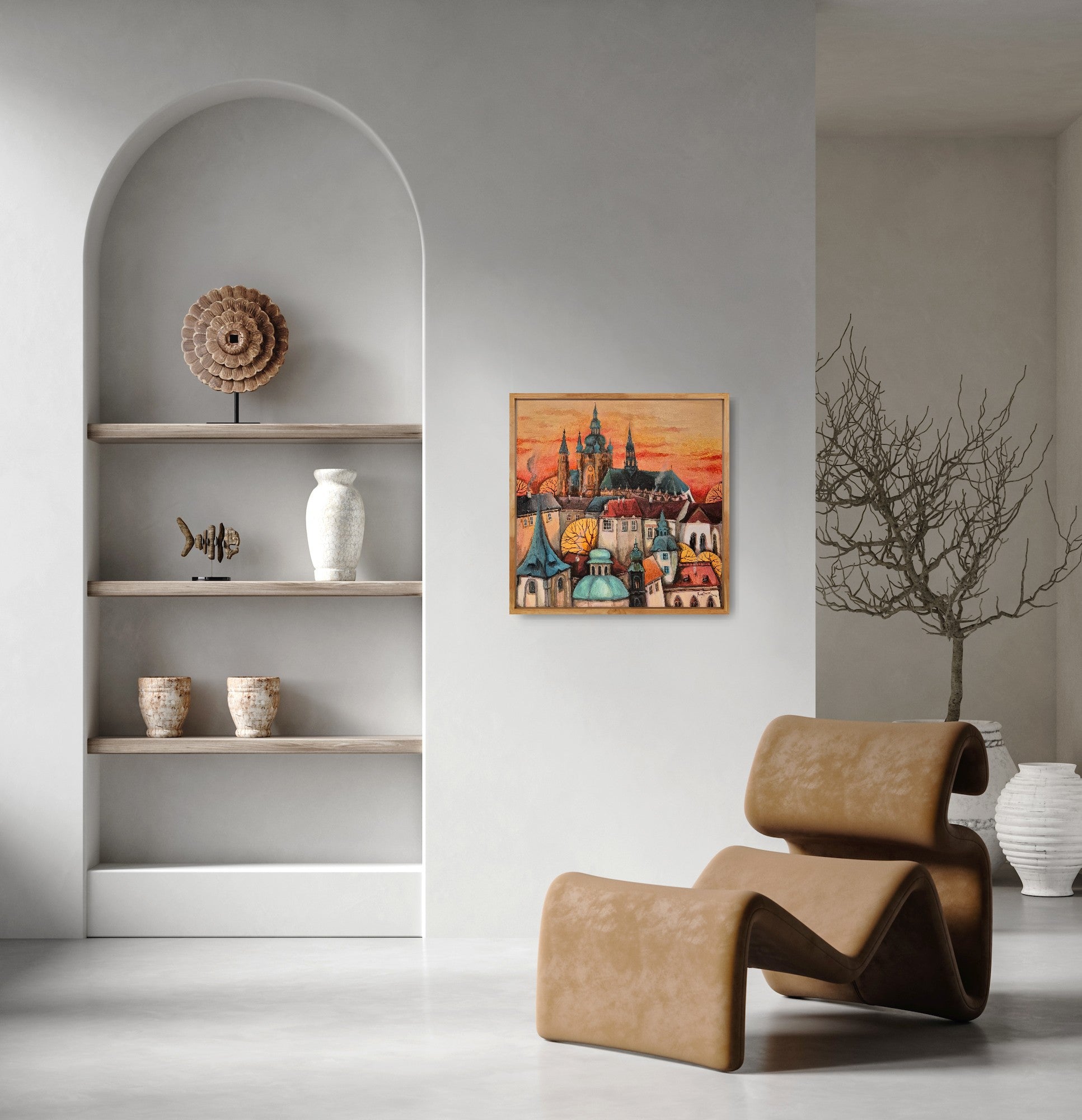 Ide o maľbu v zemitom, teplom a štylizovanom štýle. Budovy sú zobrazené s expresívnymi kontúrami a mierne skreslenou perspektívou, co je pre moju tvorbu typické. Nad mestskou zástavbou sa majestátne týči komplex Pražského hradu so svojimi vežami a chrámovými fasádami, ktoré sú zatienené, ale rozpoznateľné.