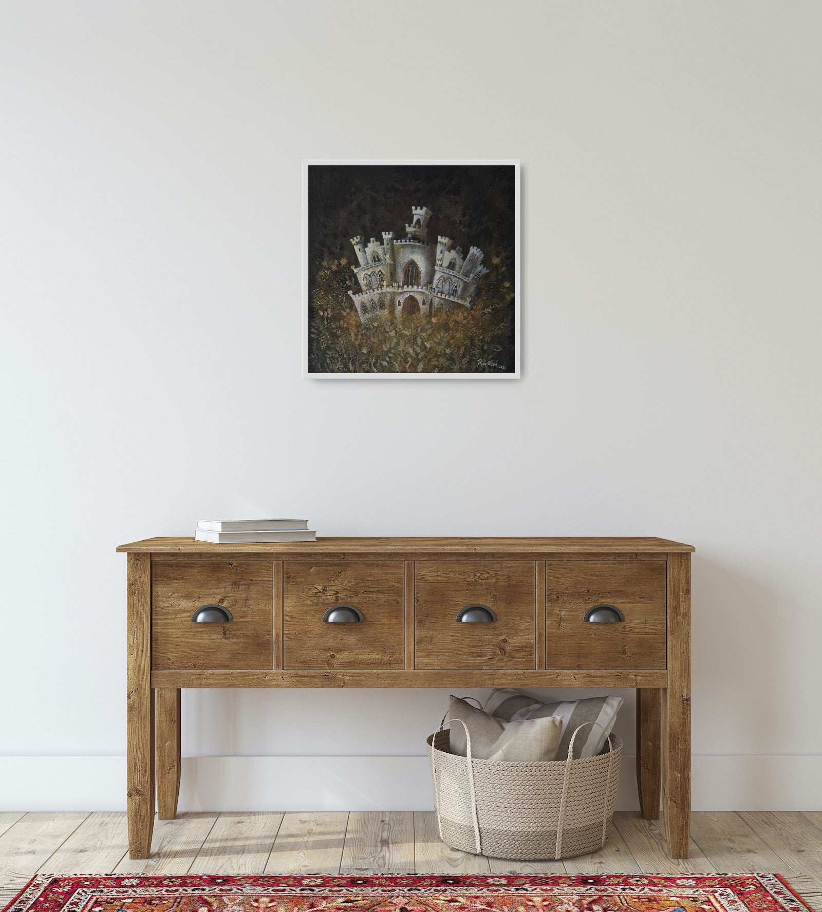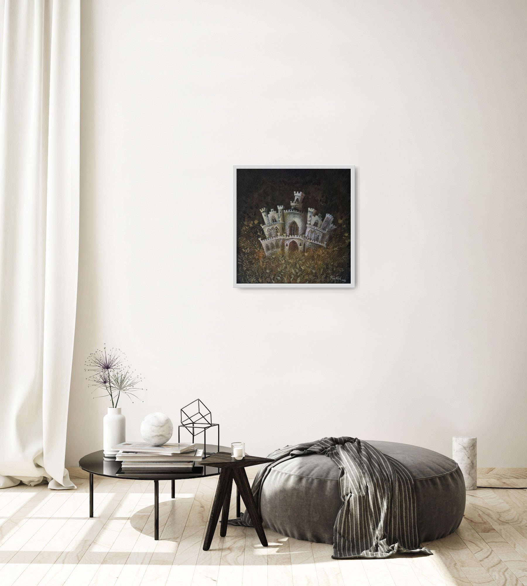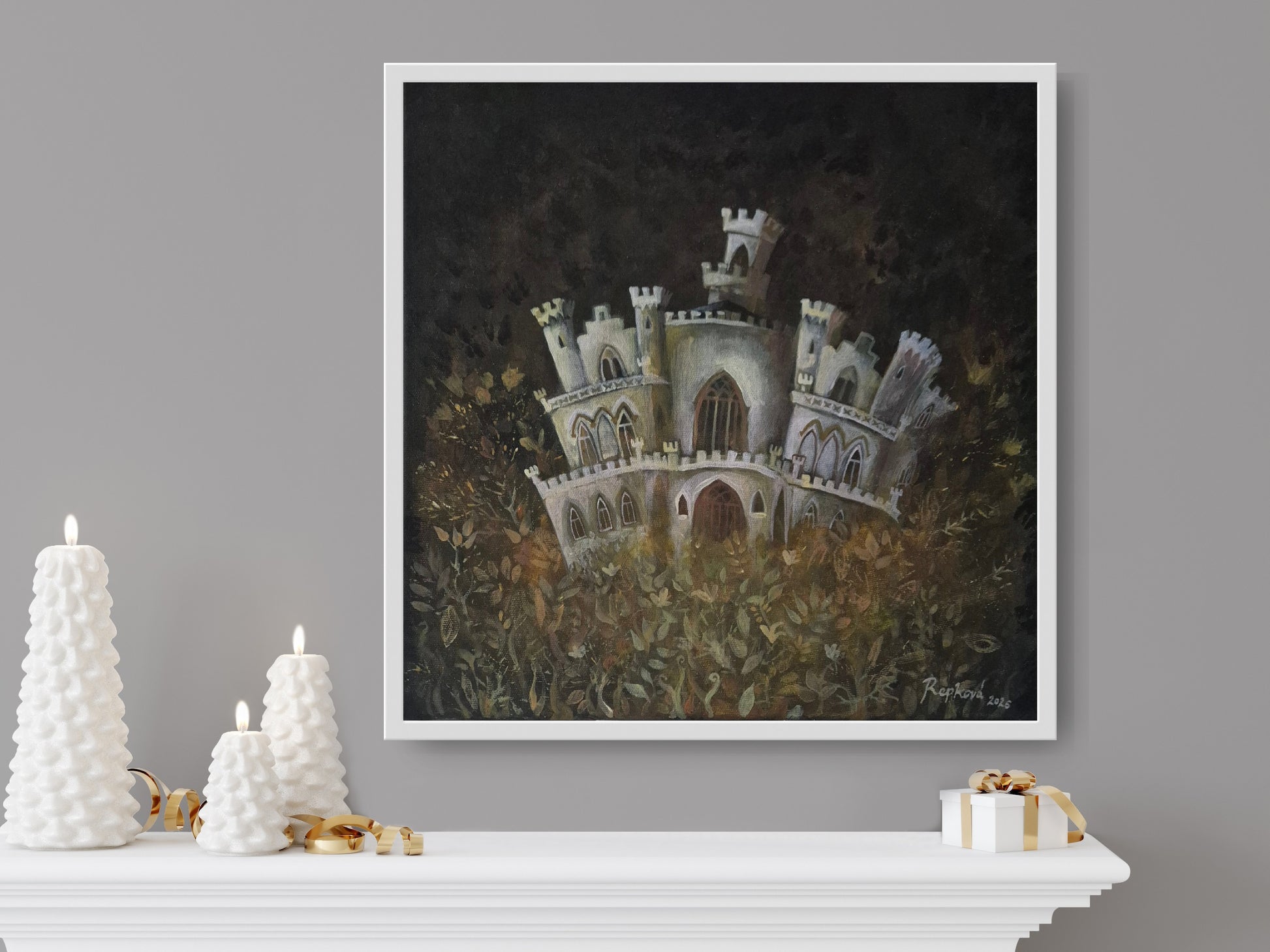 Dominantným prvkom kompozície je kaštieľ, ktorého štruktúra pôsobí akoby bola vytesaná z čistého svetla. Kľúčovým naratívnym prvkom je spodná časť maľby, kde sa architektúra plynule prelína s organickým svetom. Vegetácia nie je len zobrazená štetcom; je texturálne akcentovaná technikou odtlačkov, čo jej dodáva surovú, takmer reliéfnu hmatateľnosť. Tento kontrast medzi architektúrou a živelnou, vrstvenou vegetáciou vytvára dialóg medzi civilizáciou a prírodou, ktorá ju pohlcuje.